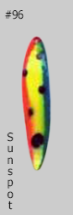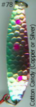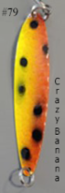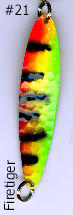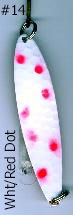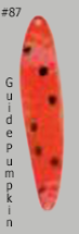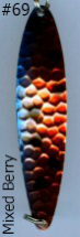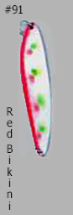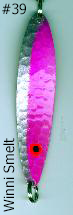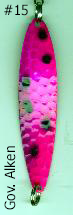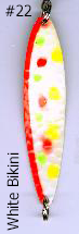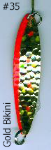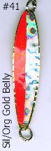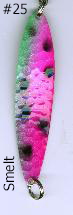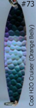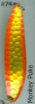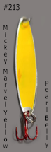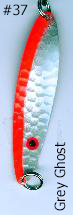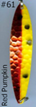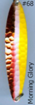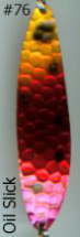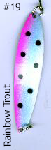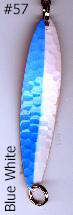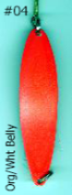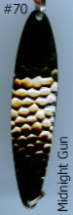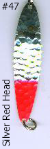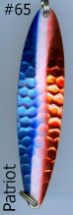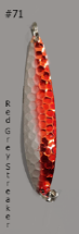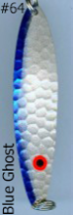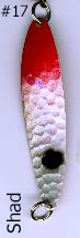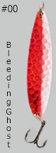 A.J.'s customized Moosalamoo Top Gun was developed to give the angler a slightly larger, slightly thinner lure. It has won many derbies in the Northeast. Available in all spoon colors and customized taped series of spoons. To order custom taped spoons click here.